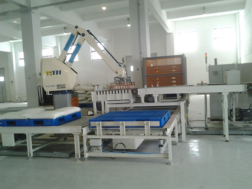 全自动智能码垛系统流程包括压袋,码垛,托盘摆满后叉车叉走。